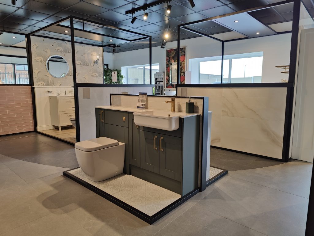 A full bathroom suite display features a complete bathroom setup – including floor and wall tiles, vanities and fittings – presented just as they would be installed in a home.