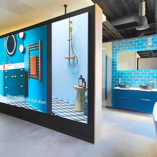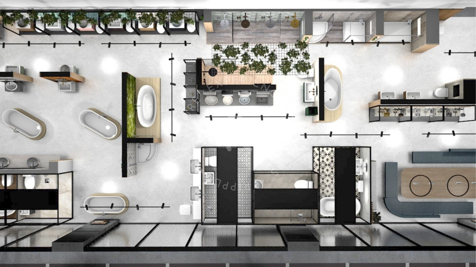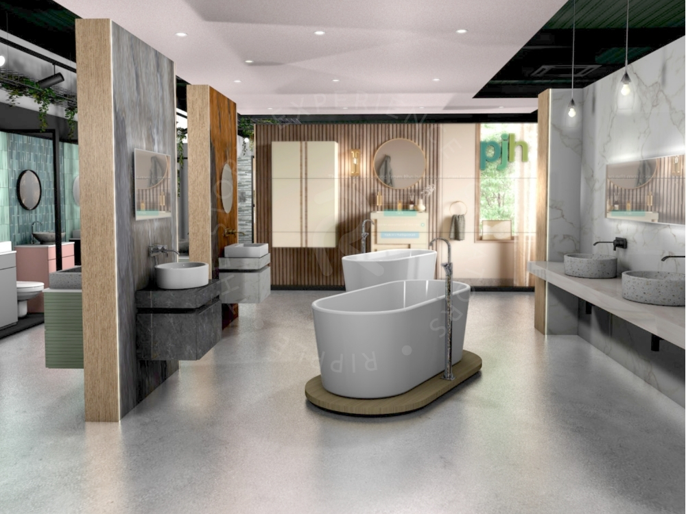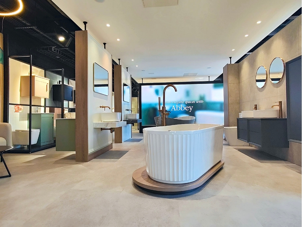 Ripple-designed pods display full bathroom and kitchen sets in a compact footprint. Products can be swapped or refreshed without structural work, keeping the showroom current without disruption.